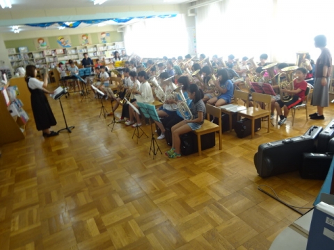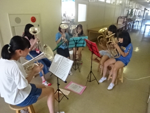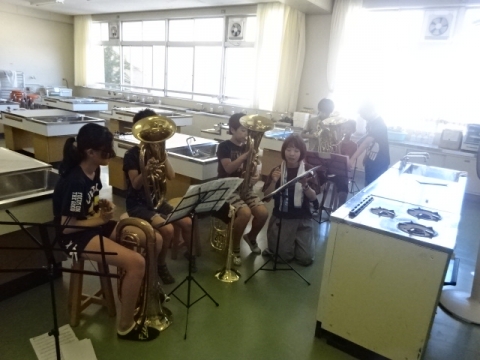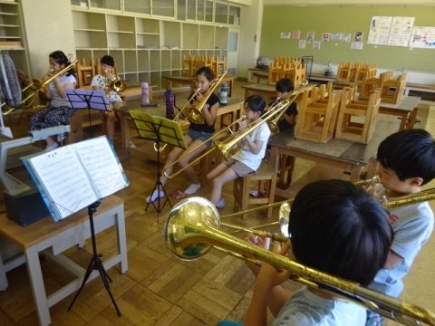 金管バンドクラブは、納涼祭りや秋の行事での演奏にむけて、がんばって練習をしています。