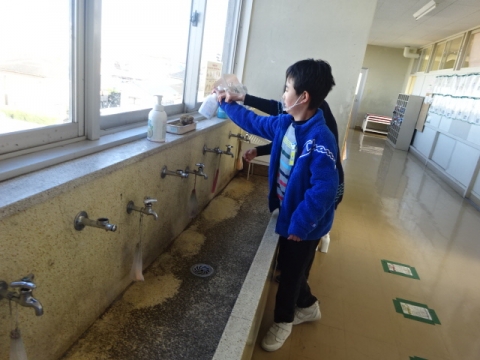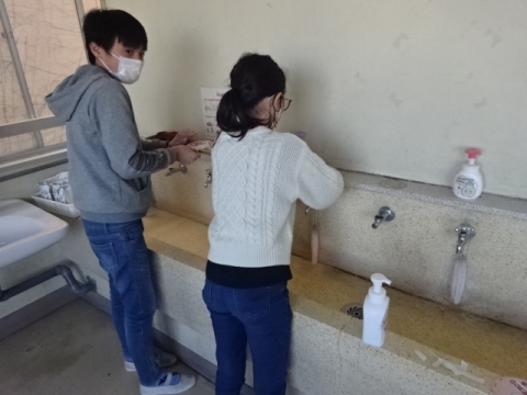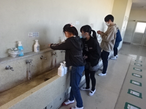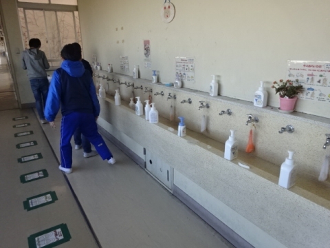その後市教委からの支給も増えたので、手洗い場への設置数を増やすことにし、きょうは保健委員が設置作業をしました。