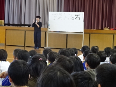 はじめに「アストンの石」という絵本を放送で読み聞かせしてもらいました。(絵は見せずに)
