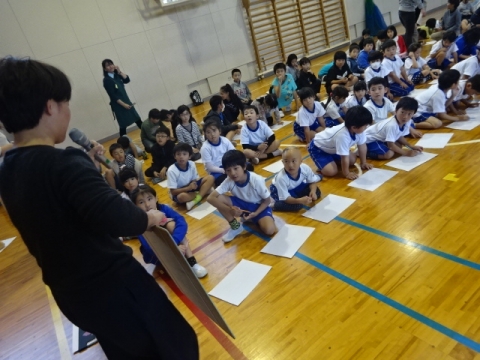絵本作家のつつみあれいさんや、図書館ボランティア・巡回司書のみなさんにお世話になり全校でワークショップをしました。