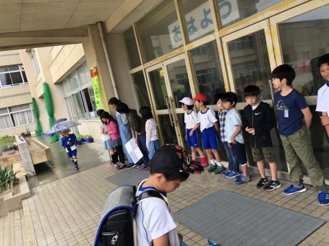 最終日はあいにくの雨でした。昇降口の軒下と入った中でしました。