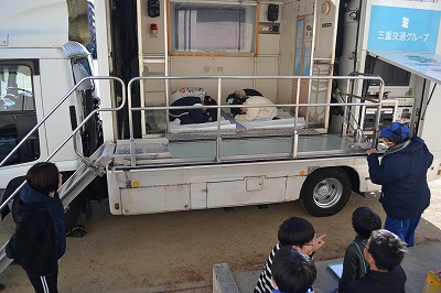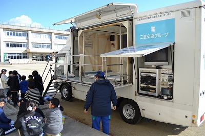 4年生が、県庁の職員の方から、起震車体験をさせていただくと