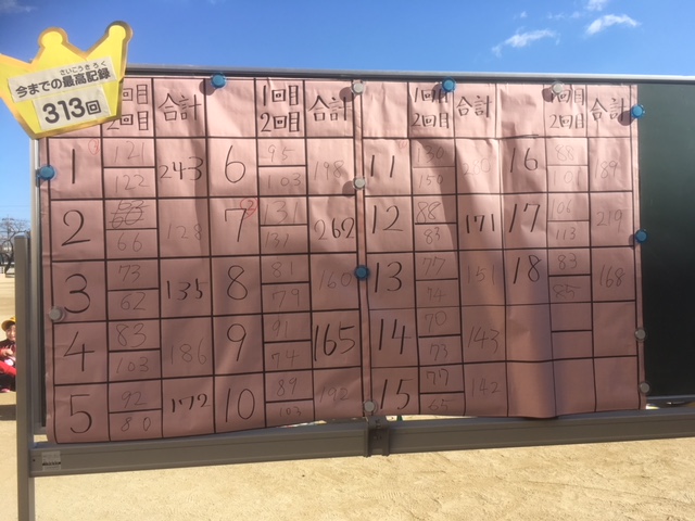 1位は、♪ダラダラダラダラダラ♪ な・な・なんと280回跳んだ11班でした。
