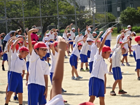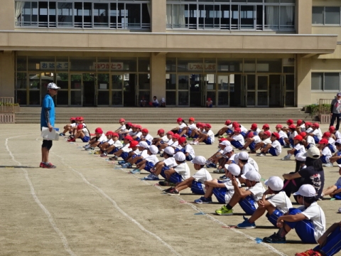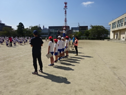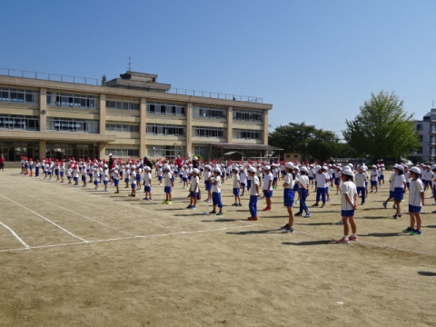 3連休明けは快晴で暑くなりました。運動場で開会式の練習をしました。