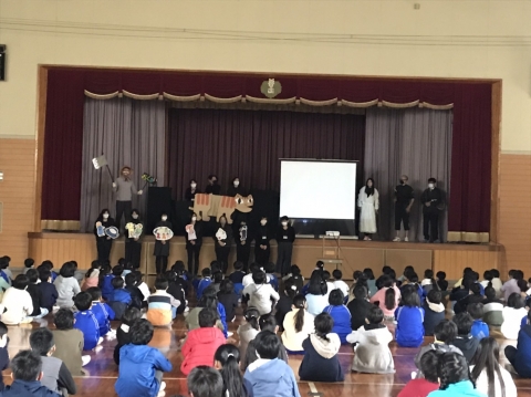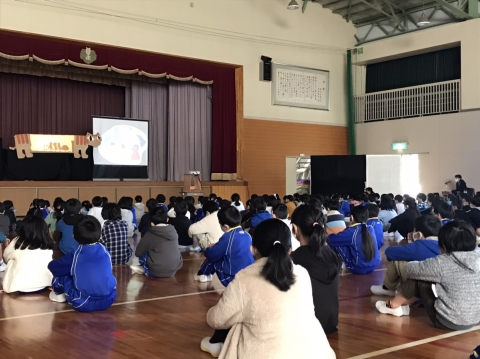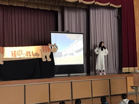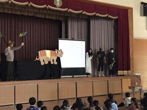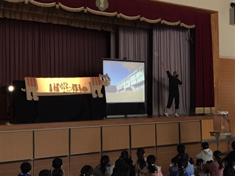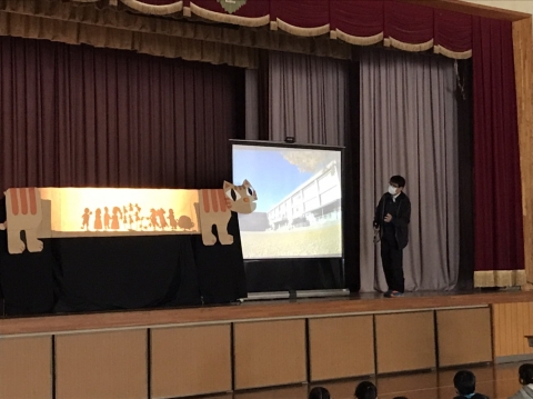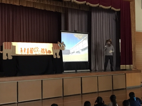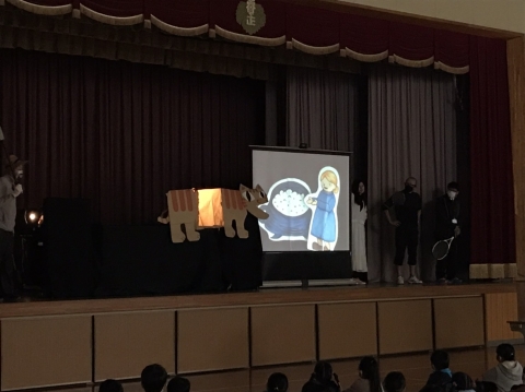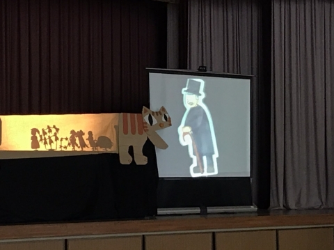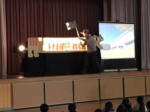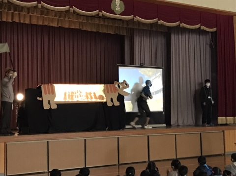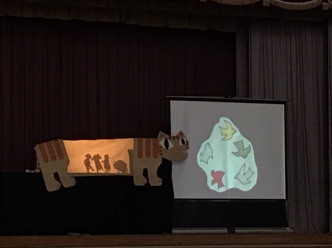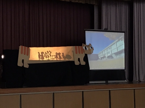 昨年度、会議室でしてもらったものをパワーアップし影絵とプレゼンテーションと実物の人間(先生たち)の組み合わせという多次元の構成の養正verにしてもらい子どもたちも大喜びでした。