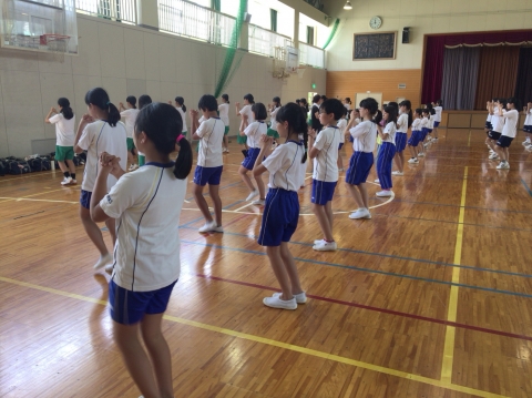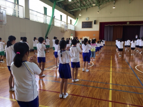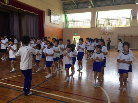 本校の体育館でマーチング講習会があり、金管クラブのメンバーのうち24人が中学生といっしょに講習をうけました。