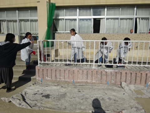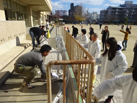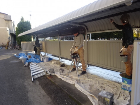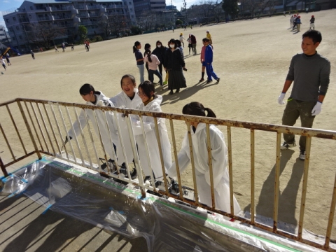 市内の塗装業者の方々が、どこかの学校に貢献するところを探していると声をかけていただき、無償で自転車置き場と校舎前の手すりの塗装をしていただきました。6年生の代表の児童も昼休みに体験作業をさせてもらいました。