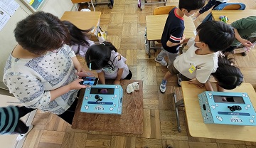 課題が早く済んだ子から、タブレットでプログラミング体験。