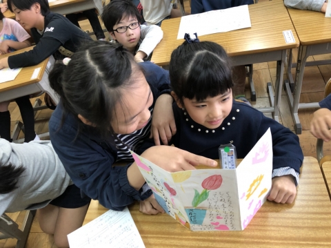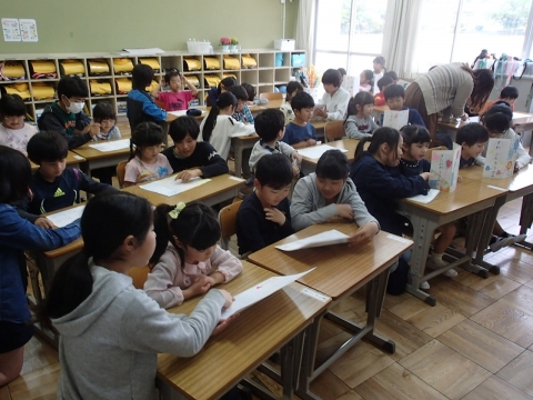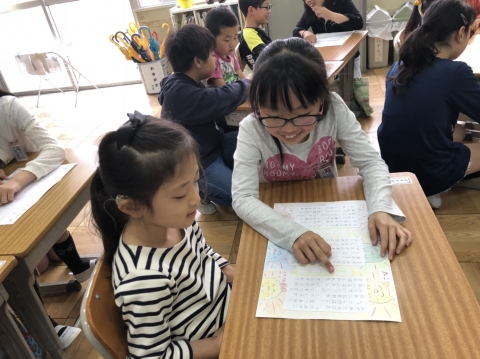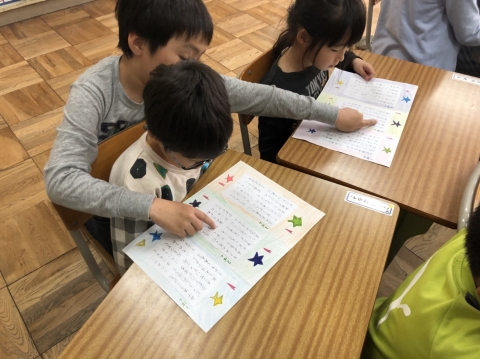 毎年伝統の行事です。かわいいきれいな歌詞カードも用意し、1年生一人一人について6年生が教えてくれます。