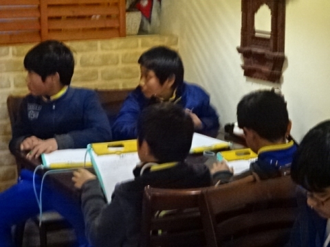 課題が早く済んだ子から、タブレットでプログラミング体験。