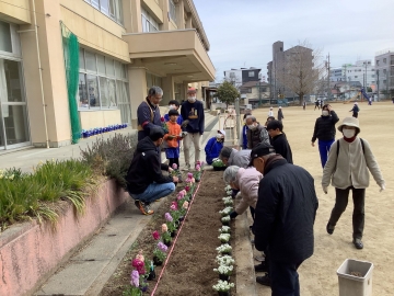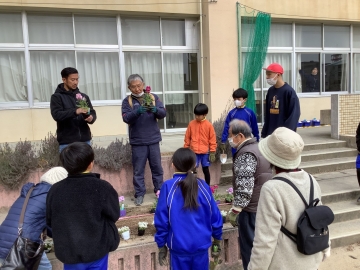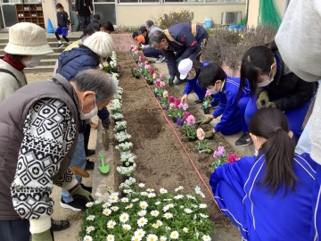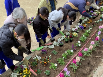 2月10日(火)、パールクラブの皆さんに来ていただき、園芸委員会の子どもたちと一緒に学校園の花植えをしていただきました。原さんに花植えで気をつけることを教えていただいた後、学校園に隙間なく花壇いっぱいに花を植えました。今年は多くの種類の花をたくさん集めることができたので、花壇が美しい花で満たされました。寒い中お越しいただいたパールクラブの皆さん、本当にありがとうございました。大切に育てていきます。