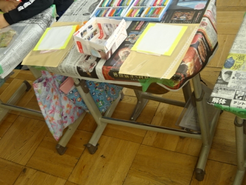 唯一教室の机を使った4年生は、新聞紙で机をくるんでもらい、またディスタンスのため間にパステルをおく机を一つ挿入