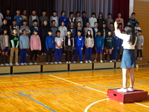 今日は、1年生から4年生までの子どもたちが6年生とお別れ式を行いました。