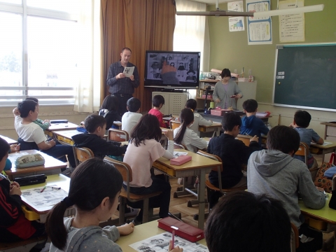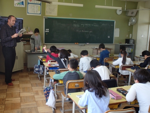 きょうから新しいALT(英語指導助手)の先生に来てもらいます。ジョン先生です。まずは身長の大きさにビックリでした。