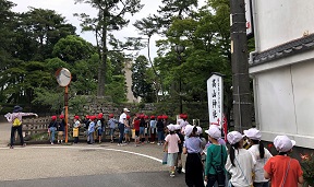 校区内にある、市役所 リージョンプラザ 図書館お城西公園 高山神社 日本庭園 中央郵便局 裁判所 NHK を歩きながら場所を確認したり、気づいたことをワークシートに書き込んだりしました。
