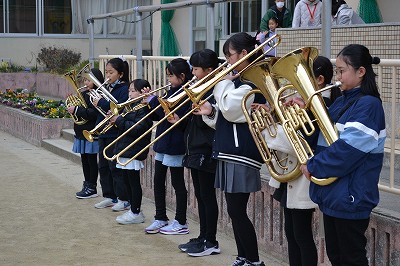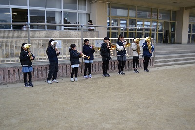 お昼休みに金管バンドの4,5年生がゲリラライブを開きました。
