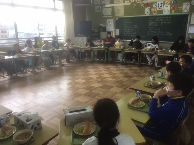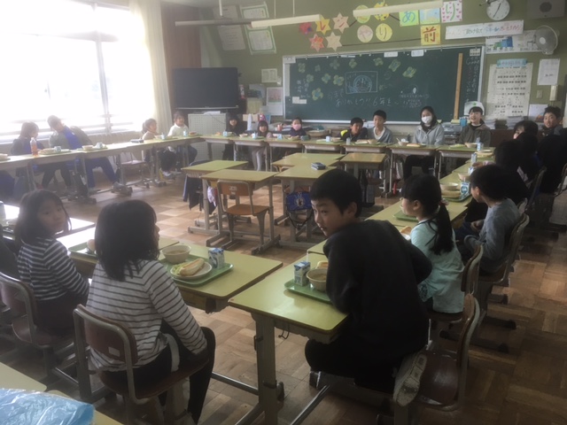 給食を各クラスで準備し、放送の合図で縦割り班のクラスへ移動しました。
