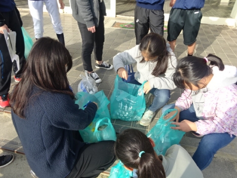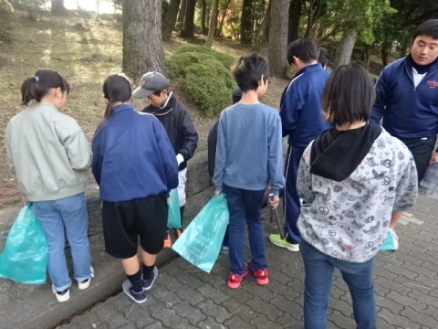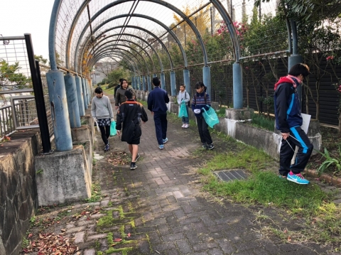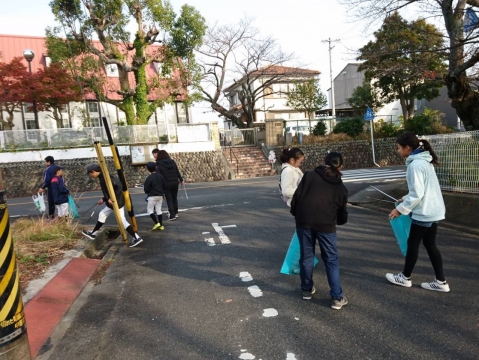 途中から代表の児童と一部保護者の方と先生たちは西橋内地区青少年育成協議会のふれあい清掃へ  小中学生と大人がいっしょにウォーキングしながら清掃活動をしました。