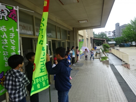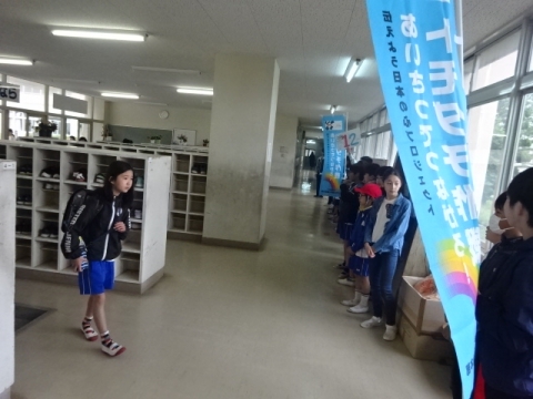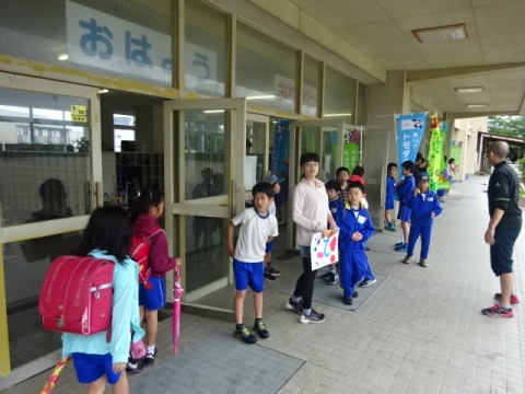 初日のきょうは残念ながら雨だったので、児童用玄関の軒先と玄関内のろうかであいさつの声かけをしました。