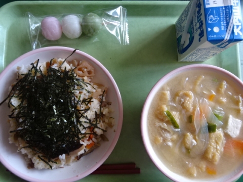 3月3日が休みなので、きょうが行事食になり、チラシずし・三色だんご・白みそ汁でした。