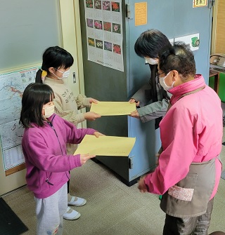 今日は、地域の人たちにお礼の手紙を渡しました。しっかりお礼言えましたね。