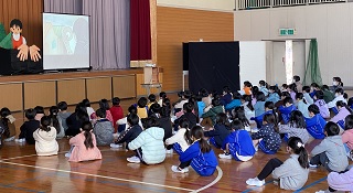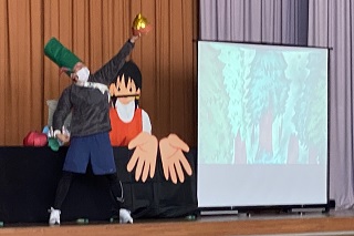 お話集会では、子どもたちが物語に楽しんで接することができるように図書館ボランティアさんが、脚本や小道具、大道具などすべて作ってくれた物語劇を全校で観ました。