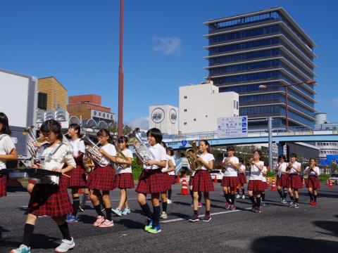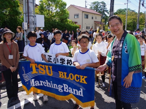 金管バンドクラブはマーチングの先頭です。 市長さんからもパワーを注入していただき、お手伝いのボーイズ3人もにっこり