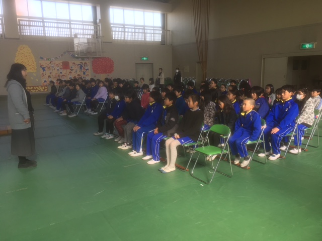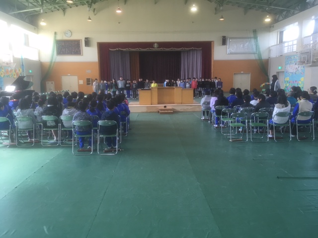 今日は、1年生から4年生までの子どもたちが6年生とお別れ式を行いました。