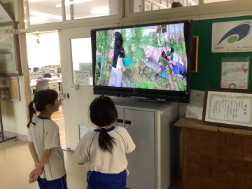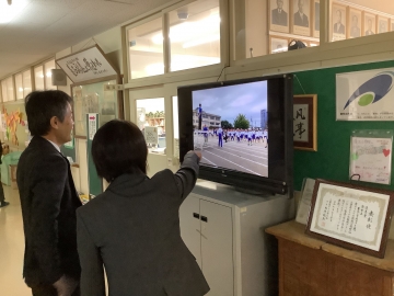 一学期の途中から、職員室前にある大型モニターにて学校での子どもたちの様子を紹介しています。現在は「運動会特集」と題して、徒競走や学年競技、表現運動などの写真や映像をパワーポイントを使って流しています。月ごとに学校行事での様子や学習の様子、その他委員会活動の様子などが常時流れているので、来校者の方に観ていただいたり、休み時間にも子どもたちが観ている様子が見られます。