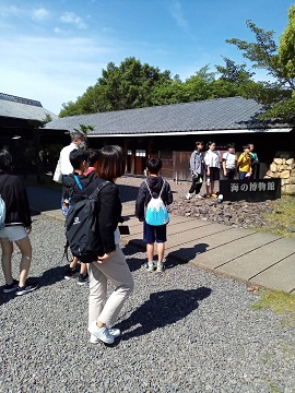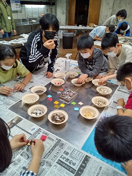 最初の見学地、「海の博物館」です。展示室を見学して、貝殻を使って自分だけの作品を制作中です。