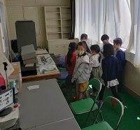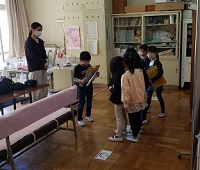 職員室では、「ここで、先生たちが仕事をしています。」、保健室では、「けがをしたらここで、手当てをしてもらえます。」等自分たちが事前に調べたことを上手に説明していました。