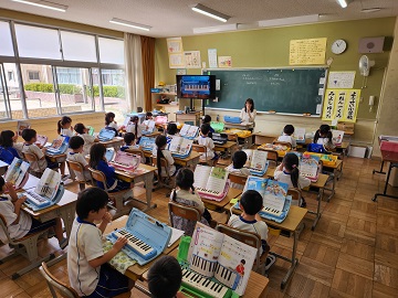 1年生が鍵盤ハーモニカの練習をしていました。うまく音を出すために、息を上手に入れることができていました。