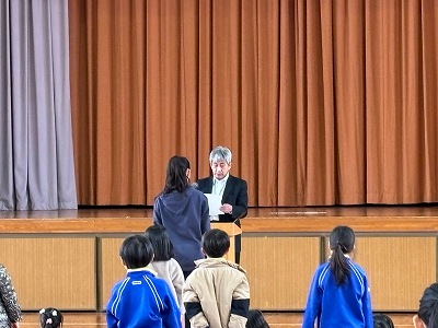 離任式では、学校を離任する先生たちから話をしてもらいました。学校長も役職定年することに伴い、子どもたちが卒業式をしてくれました。感激でした。