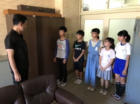 児童会で話し合った結果、雨の日の休憩時間に教室ですごすためのグッズが不足していることを役員が校長室までお願いに来ました。緊張の表情?