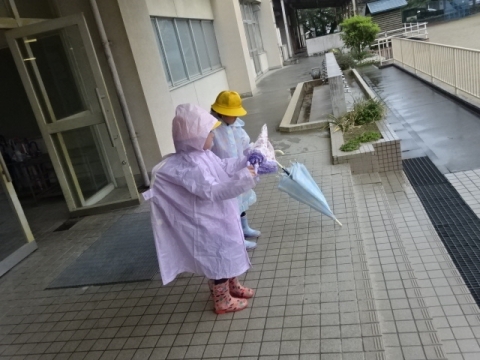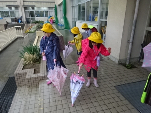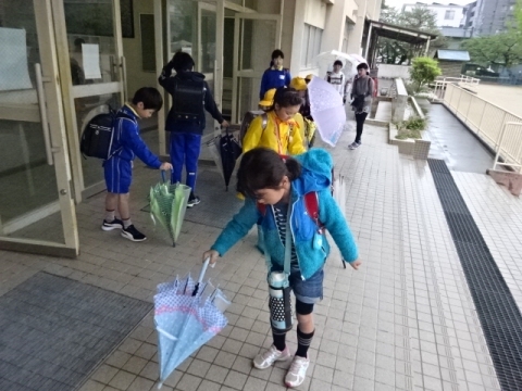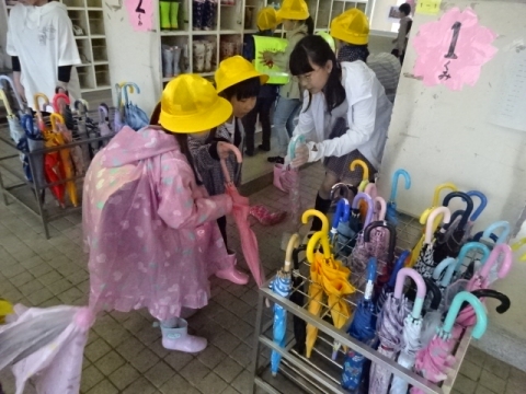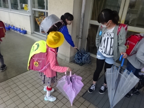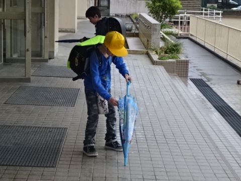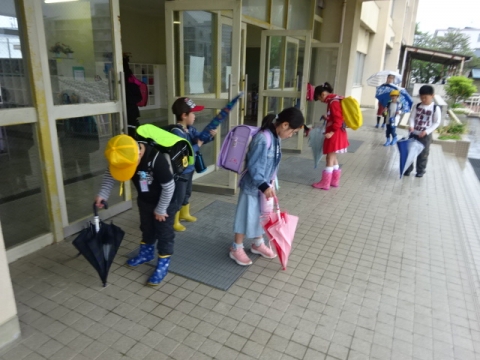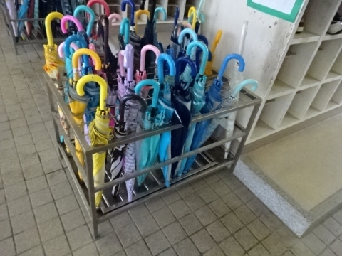 本校の伝統の良い習慣である、玄関に入る前にカサのしずくをはらい、きちんとベルトをかけてからカサ立てにいれることが続いています(もちろん全員とはいきません)。