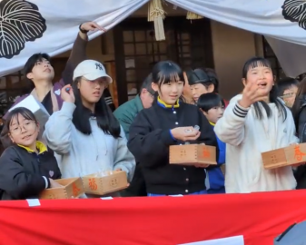 2月3日(火)の節分の日に、午年生まれの5年生が髙山神社さんからご招待いただき、境内にて節分の豆まきをさせていただきました。5年生の子どもたちが神殿から「鬼はそーとー!」「福はうーちー!」と言いながら勢いよく節分の豆をまくと、集まった人たちから「こっち、こっち!」と声が聞こえました。子どもたちも笑顔いっぱいで豆やお餅をまいて、終わった後も「あー!楽しかったー!」ととても満足そうでした。地域の伝統的な行事に参加できる子どもたちは幸せです。