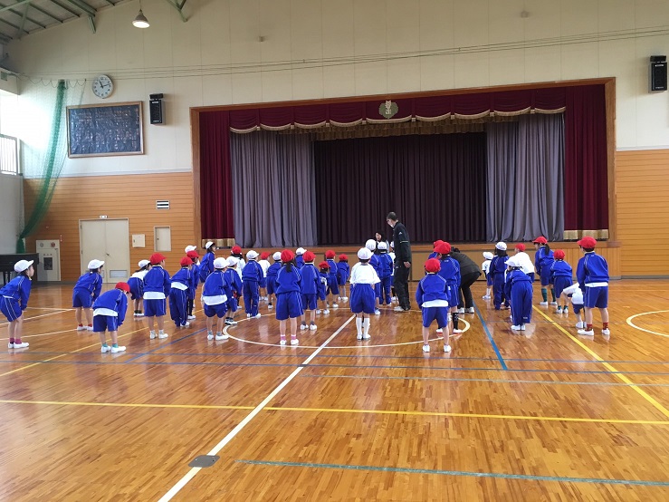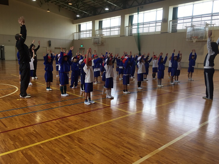 1年生は、体育の時間に、体操の隊形に並んで準備体操をしていました。