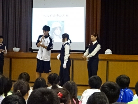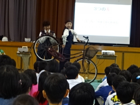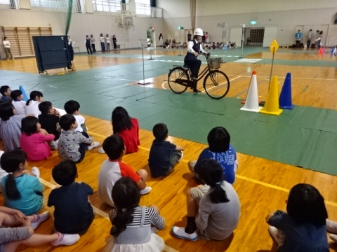 PTA本部と地区安全委員のみなさんが中心となっていただき交通安全教室を開催しました。市・津警察の担当の方から指導をいただき、はじめは全校で自転車乗車時や歩行時の安全について学習しました。そのあと、低学年の子たちが歩行について実技指導をうけました。(雨だったので自転車の実技はできませんでした)