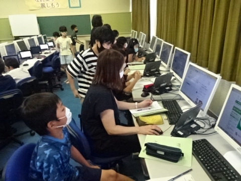 課題が早く済んだ子から、タブレットでプログラミング体験。