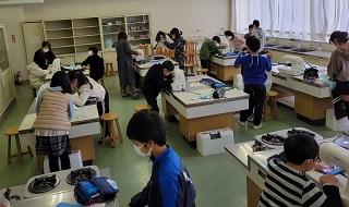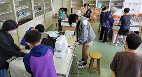 家庭科の学習で、ミシンを使う際に地域の人にお手伝いに来てもらっています。