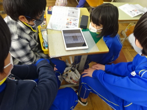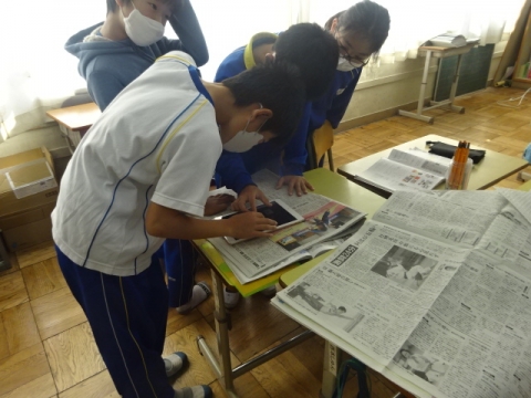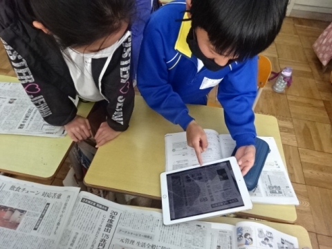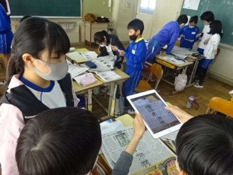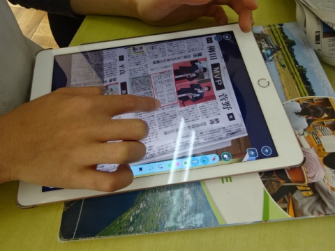 5-1 社会科 2つの新聞を比較し、同じ出来事でも扱い方がちがうことの学習にタブレットを使ってみました。違いのある部分を見つけて、タブレットで写真に撮り、発表のしかたを考えて、発表のときは画面にアンダーラインや囲みが出るように工夫してやってみました。