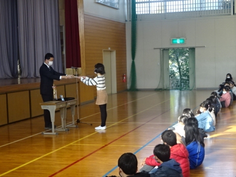 感染症予防のため、間隔を大きくとり、窓はほぼ全開、表彰の返事はなし、校歌もなしという形で行いました。久しぶりの体育館での式でしたが、6,5年生が静粛に入場し手本になってくれたので、引き締まった式になりました。