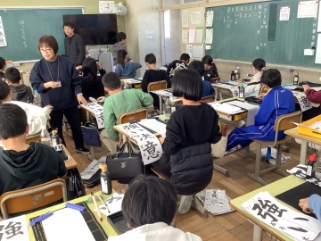 3年生以上の学年では、書写で習字を学習します。子どもたちの中には筆と墨を使っての習字に苦手意識を持っている子も多いため、基本を学習することがとても大切です。本校では学校運営協議会委員でスクールサポートスタッフでもある長岡先生に習字を指導していただいているので、子どもたちも「長岡先生みたいに美しく字を書きたい!」と憧れの存在として目標にしています。どの教室でも長岡先生の話を真剣に聞き、集中して清書する姿が見られます。