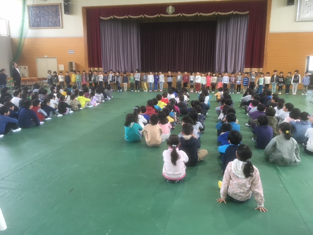 校長先生のお話のあと、4年生が「歓迎の言葉」、そして2~4年生が校歌を歌いました。