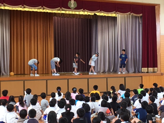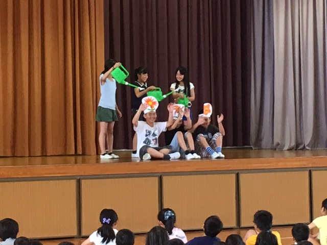校歌斉唱のあと、児童会役員の話、そして、園芸委員会、放送委員会の発表、