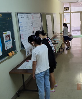 各学級ごとに、時間や参観する教室をずらしながら、みんなの夏休み中の作品を観ました。力作が多く、もっと観る時間が欲しい子どももたくさんいました。