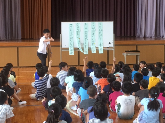 次に、生徒指導の木場先生から、夏休みの生活について、お話がありました。