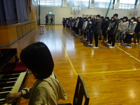 まずは校歌斉唱。 伴奏も5年生の子に引きつがれました。