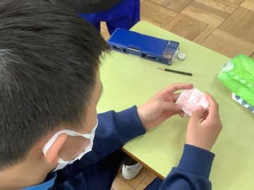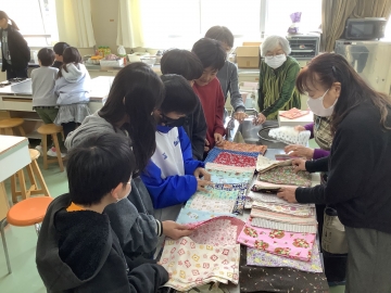 先週3月6日(金)の3・4限目、多くの地域の方々にご来校いただき、4年生対象に「巾着づくり」を教えていただきました。これは、来年度から家庭科を学習する4年生に少しでも裁縫に興味を持てるようにという願いから始まった活動で、巾着の生地も道具も全て地域の方がご用意していただきました。子どもたちは自分の好きな生地を選び、一人ずつ丁寧に手縫いの仕方を教えていただきながら全員が自分だけの巾着を完成することができました。子どもたちは「お菓子入れにしようかな」「お母さんにプレゼントします!」と完成した巾着を嬉しそうに持ち帰っていました。地域の皆様にはお忙しい中お越しいただき心より感謝致します。