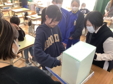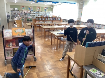先月での全校集会でも紹介した「旅する本棚」は、「本よもうねっとMIE」からの依頼を受けて久居農林高校環境保全コース木工班の生徒さんが製作してくれた移動式本棚です。この日は1年生にこの本棚を実際に使ってもらいました。子どもたちは「すごーい!本がいっぱい入る!」「本のお家みたい!」「ここに本を置くと見やすいかも」と本棚を動かして、いろいろ本の置き方を工夫してくれました。本のレイアウトも考えながら子どもたちの読書意欲も高まっている様子でした。